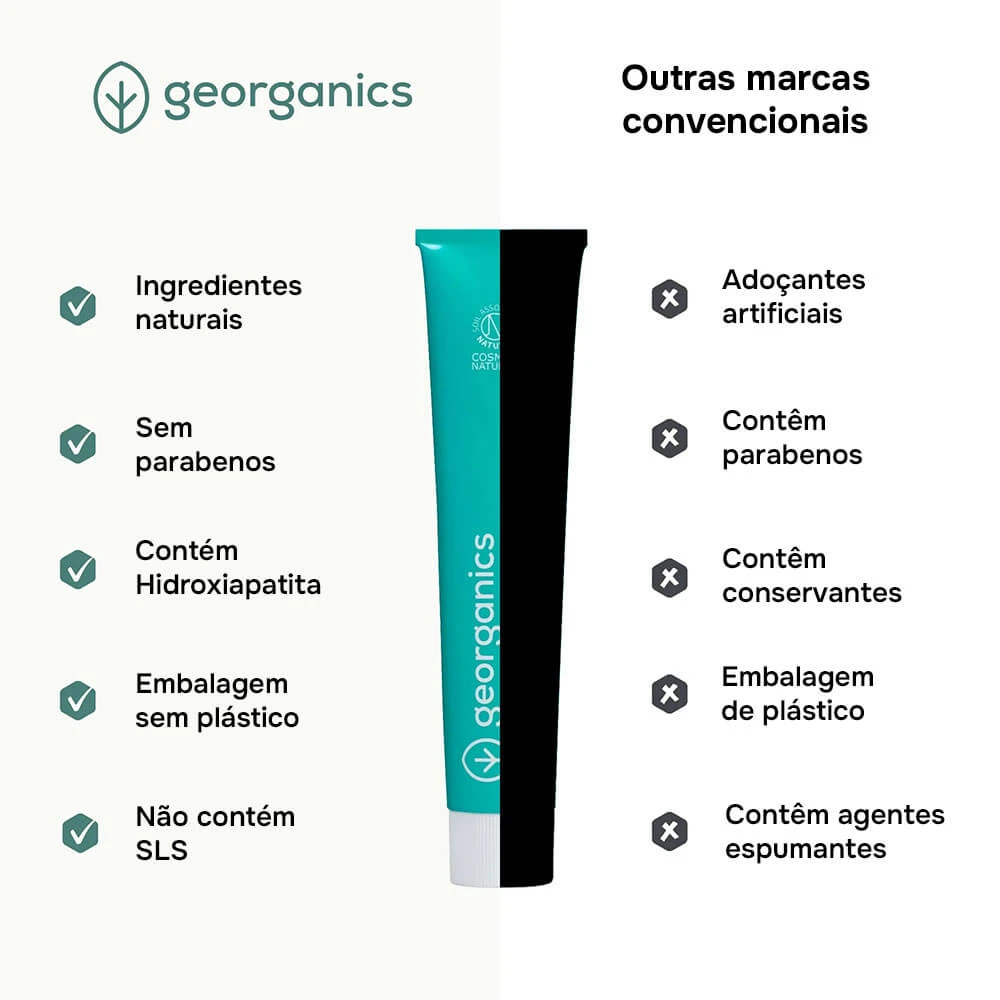 A tua rotina de higiene oral merece uma pasta dentífrica que combine eficazidade, ingredientes naturais e responsabilidade ambiental. A Georganics com Hidroxiapatite, Flúor e Menta Fresca une tecnologia de cuidado oral com uma fórmula limpa e sustentável.