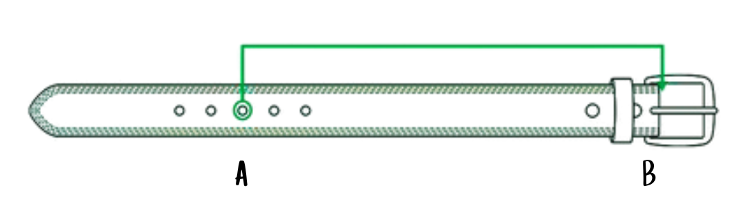 2. Meça a distância entre o furo que usa habitualmente (ponto A na imagem) e a extremidade onde começa a fivela (ponto B).
